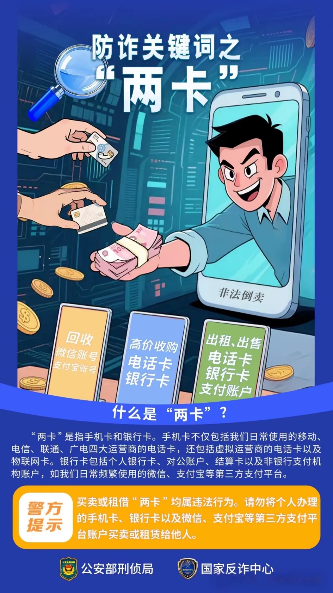 警方提示:买卖或租借“两卡”均涉嫌违法。切勿将自己的手机卡、银行卡以及微信、支付宝等第三方支付平台账户出租、出售他人!