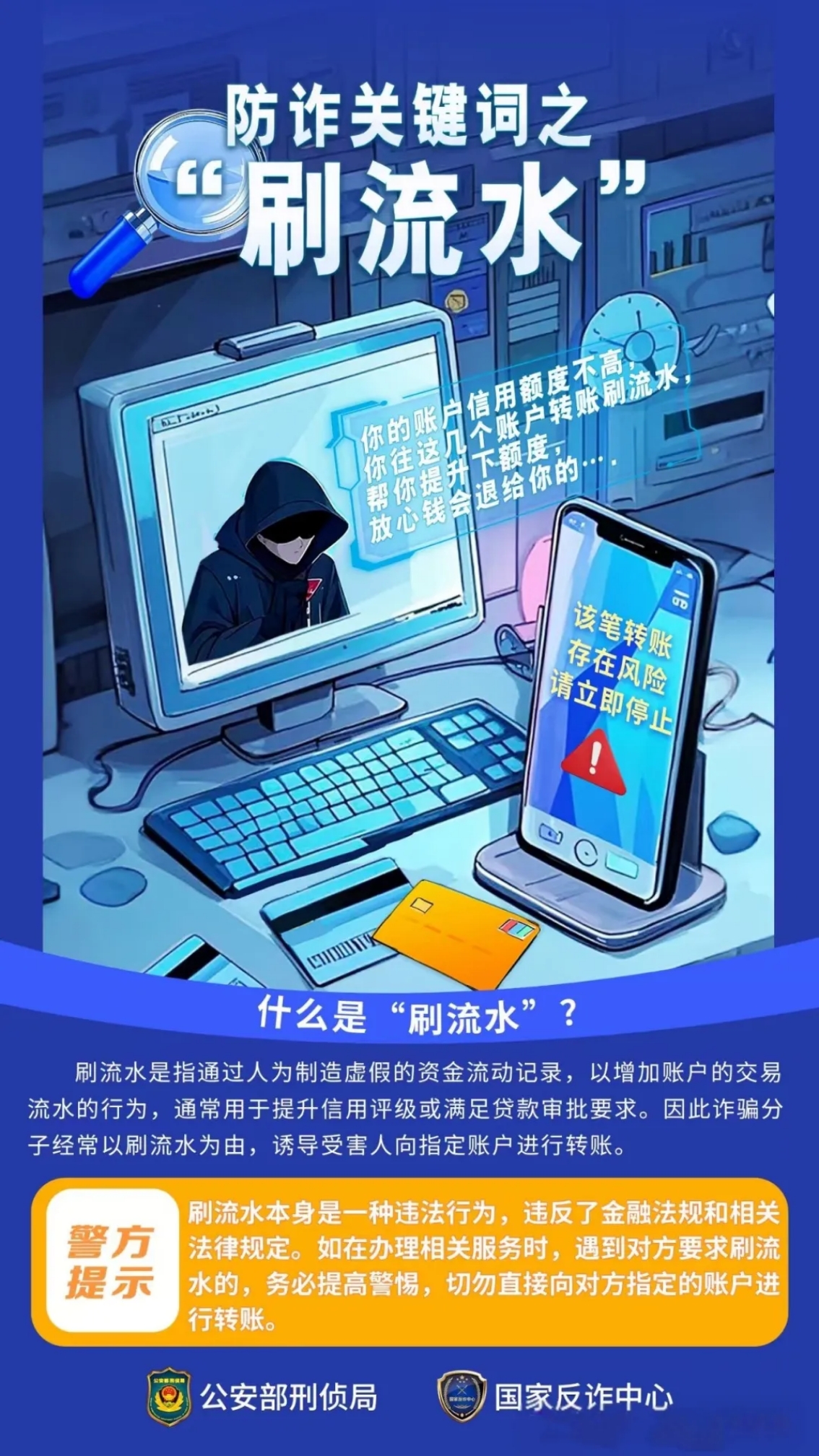 警方提示:“刷流水”是一种违法行为。如在办理相关服务时,遇到对方要求“刷流水”的,务必提高警惕,切勿向对方指定的账户转账。(来源:公安部刑侦局)